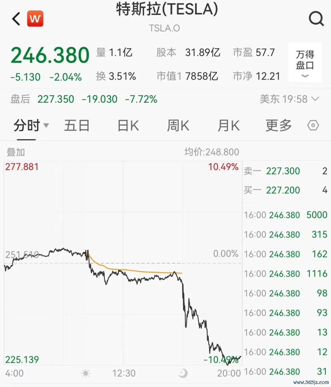 受业绩等因素影响,美东时间7月23日特斯拉股价下跌2.04%,报246.38美元/股,盘后一度大跌超8%,截至发稿,跌7.72%。